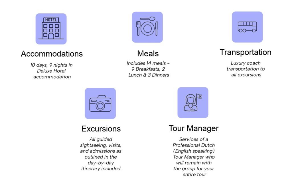 This tour involves a lot of walking. You must be capable of walking 10,000 – 12,000 steps during a day over uneven or cobblestone surfaces,