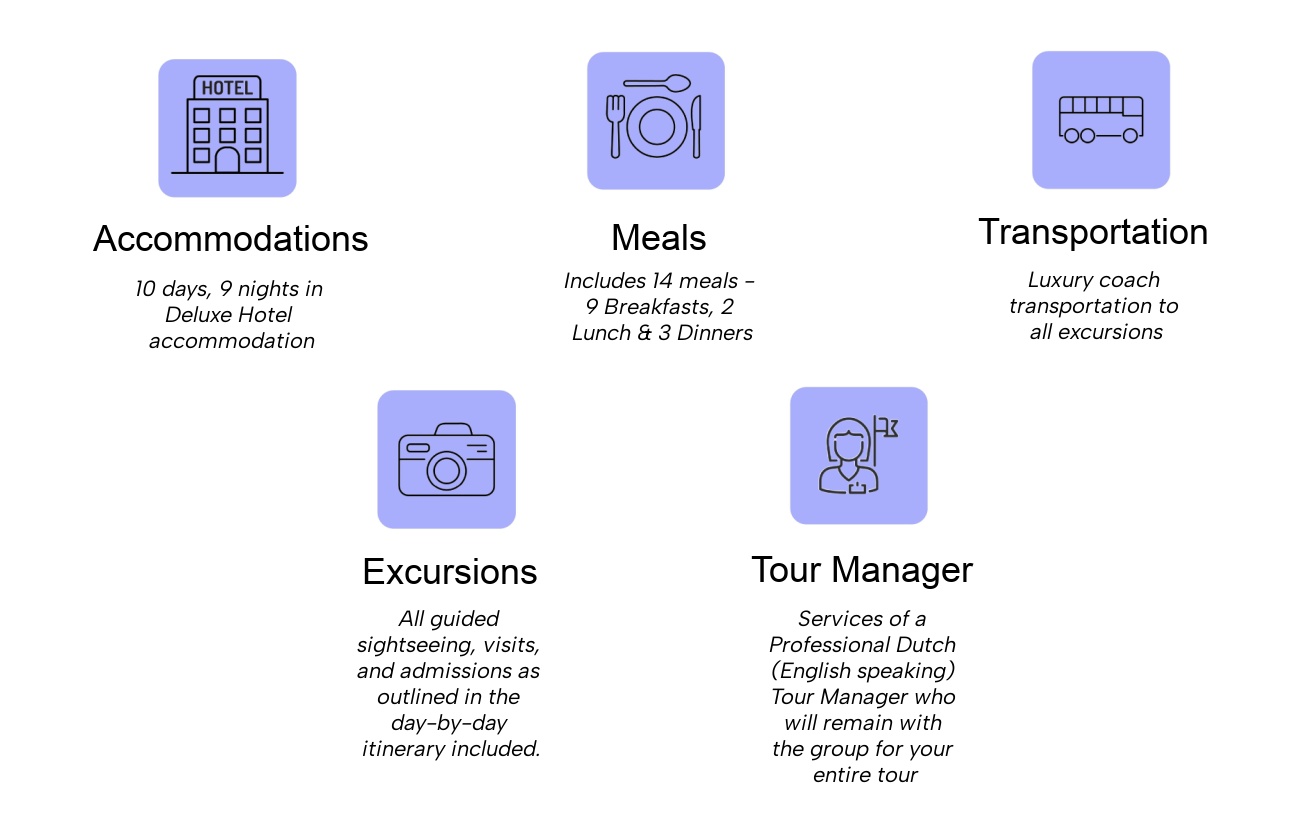(April 8) – After your early arrival, either the day before or the morning of today, we will meet your tour leaders and fellow travellers in the lobby of our hotel. Your trip to Amsterdam would not be complete without a ride in a glass-top boat with spectacular views of the city of Amsterdam. Amsterdam is well known for its many canals and bicycles. Beware of the ringing bells on the bicycles, a primary mode of transportation. After our relaxing boat ride, we will head to our hotel to check in where you can relax before our Welcome Dinner with the group.