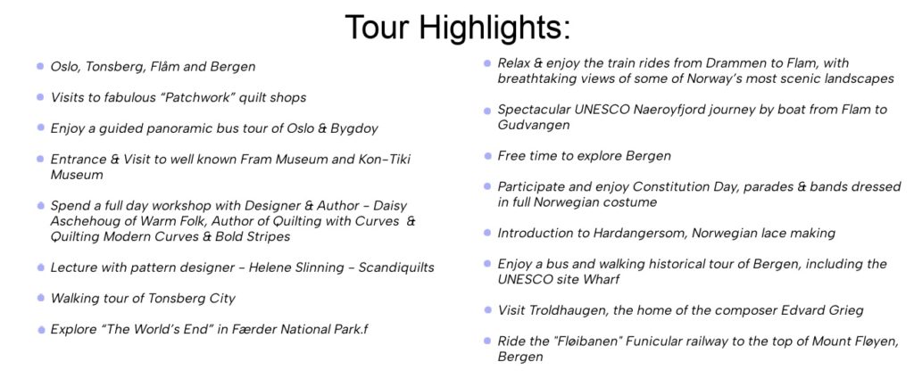Get ready to be amazed by the stunning scenery and immerse yourself in Norway’s rich culture and history. Join us for an exciting adventure that will leave you with unforgettable memories. Explore this gorgeous Scandinavian country with its mountains, glaciers, and deep coastal fjords. This tour includes an exclusive experience with a Workshop by Daisy Ashenhoug, book author and designer of Warm Folks and a Lecture with Scandiquilts designer and pattern creator, Helene Slinning.