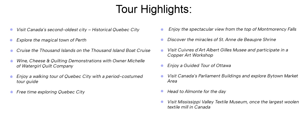 Dating back to 1608, with its narrow cobblestone streets and stone buildings lined with bistros and boutiques, it is time to visit the romantic and historical city: Quebec City. Ride the Funicular joining the upper & lower town, with the famous Chateau Frontenac Hotel towering over the city. Along our route, we will visit quilt shops and finish the tour at Quilt Canada in Toronto.