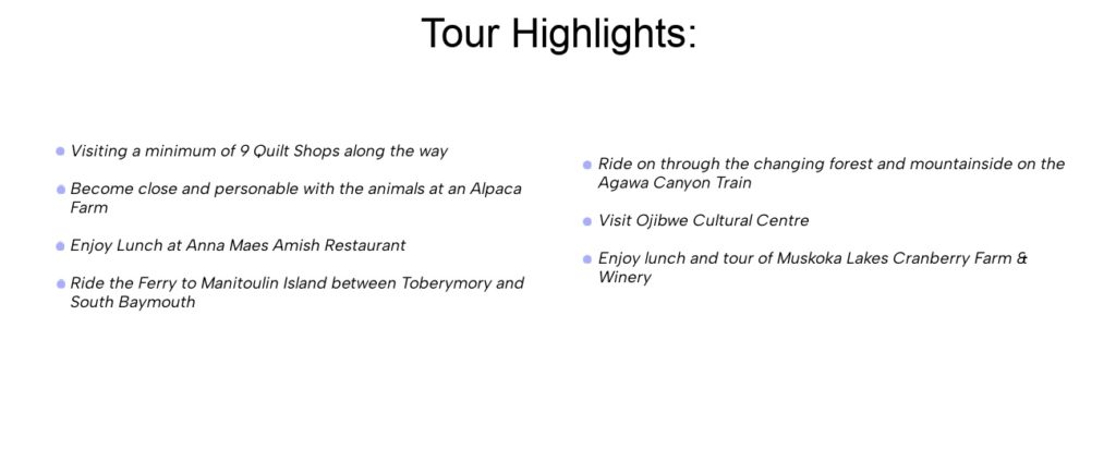 (Fri Oct 2) – On the final day of our tour, we travel to an Alpaca Farm for a very unique experience with friendly and cuddly Alpacas. We will be entertained by their owners with a tour of their home, barn, and their wonderful knowledge of Alpacas. Being in the Amish and Mennonite area of Ontario, we will stop to pick up lunch at a nearby market before heading to our final Quilt Shop. At this charming quilt shop, offering unique fabrics and quilting inspiration, we learn valuable techniques and share creative ideas. After a day filled with stitching and shopping, we gather for our farewell dinner, reflecting on the wonderful experiences, new friendships, and memories made throughout the tour. It’s the perfect end to a beautiful quilting adventure.